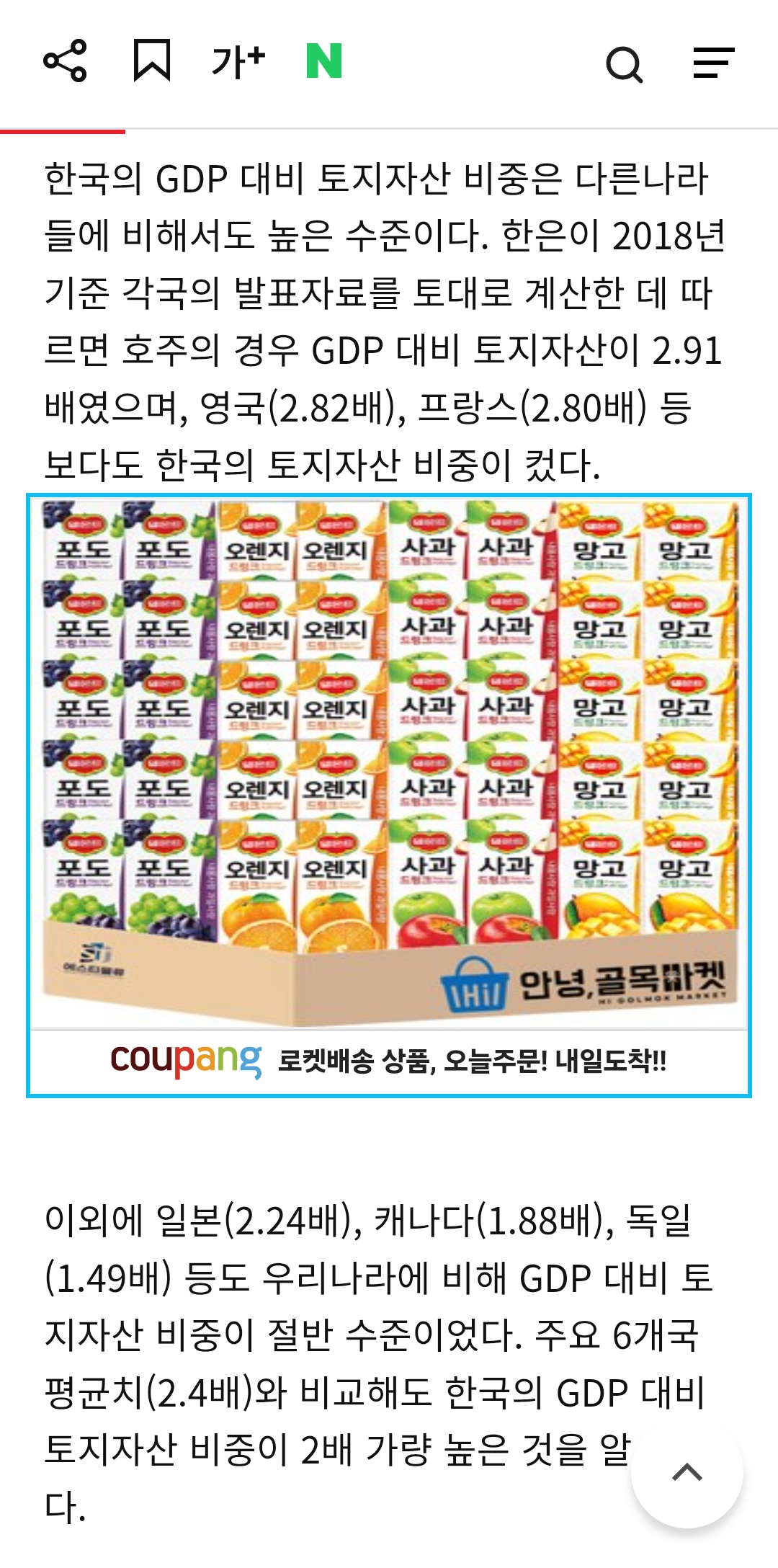 요점은 한국의 땅은 (시총/gdp) 비율이 주요국보다 2배 높다는 거지....